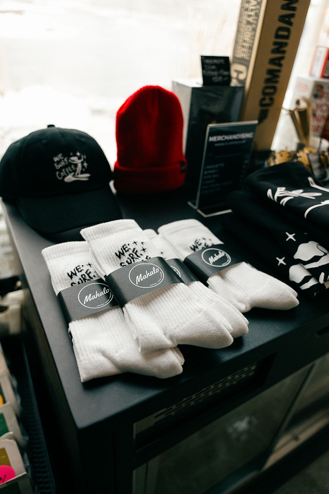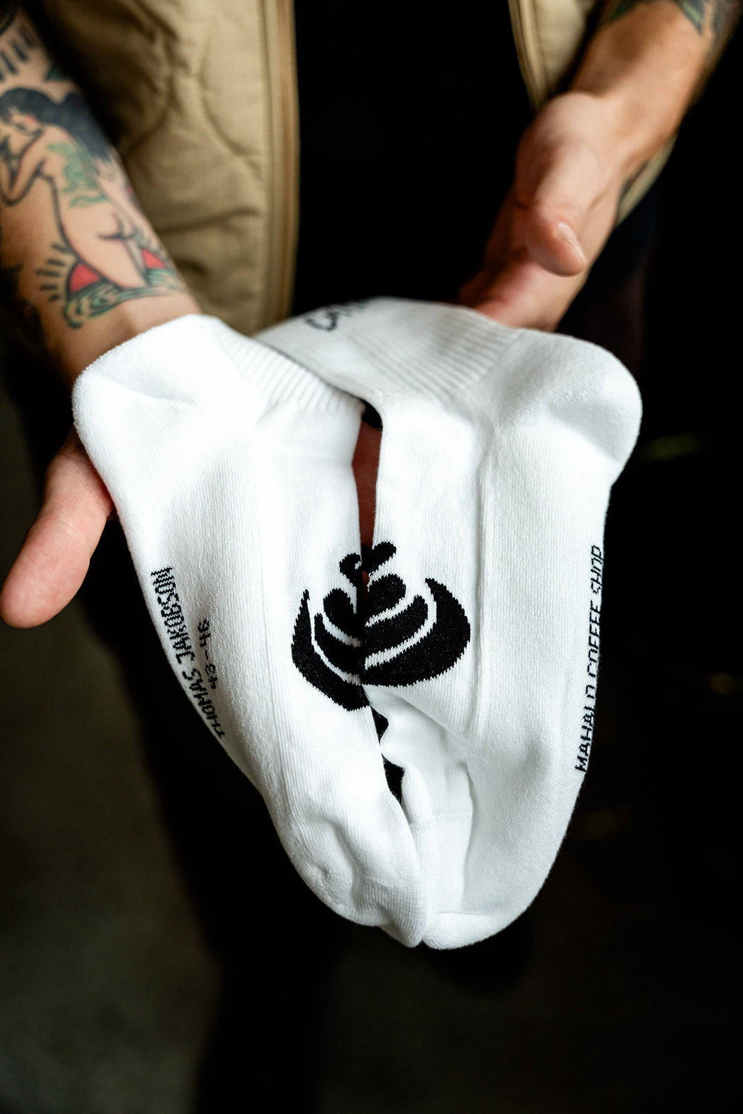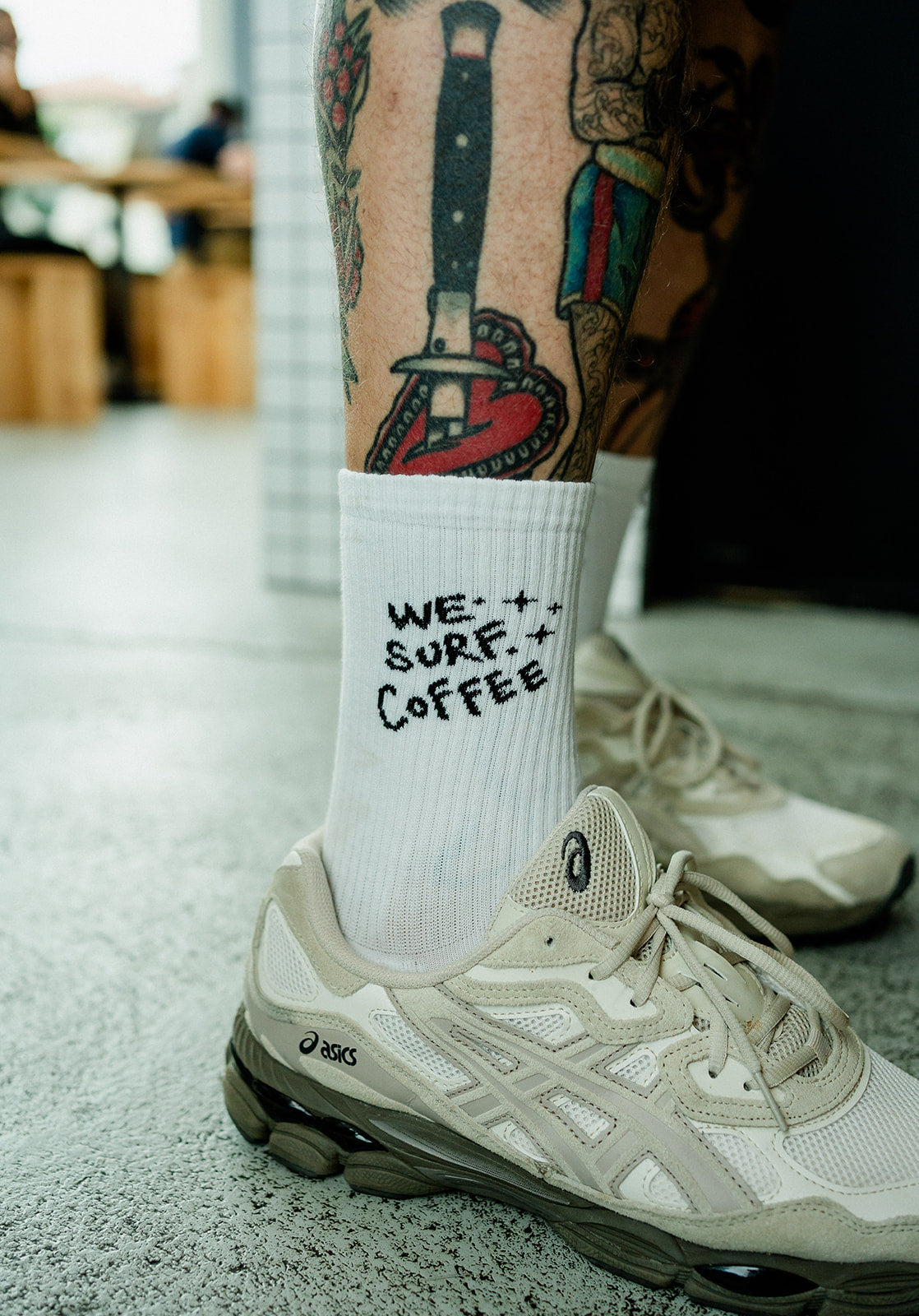 Créées en collaboration avec Thomas Jakobson et illustrées par Mitchi Pitch, artiste et surfeuse originaire des Philippines, ces chaussettes sont à la croisée du surf et du café de spécialité.